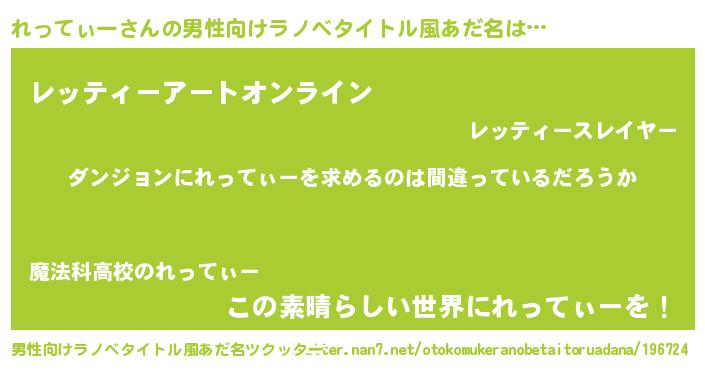 | 女子向けラノベタイトル風あだ名 | 『れってぃーの卵を拾いまして』 |