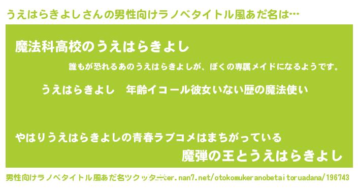 | 女子向けラノベタイトル風あだ名 | 『うえはらきよしの玉の輿計画!』 |