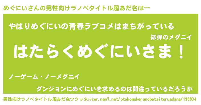 | 意味不明あだ名 | 『めぐにいフォーエバー』『自称めぐにい』 |