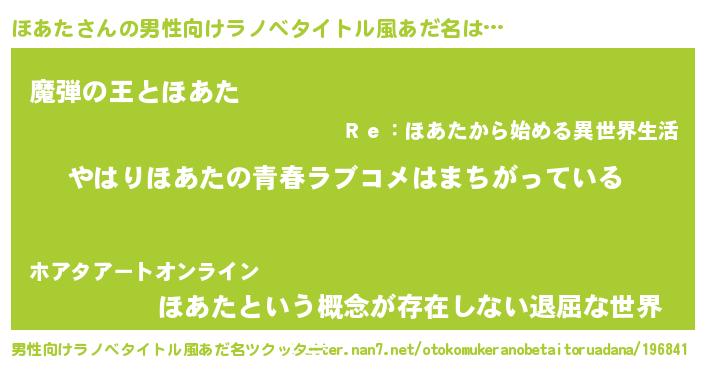 | 女子向けラノベタイトル風あだ名 | 『ほあたの雑貨屋さん』『闇のほあた』 |