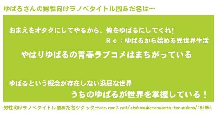 | 女子向けラノベタイトル風あだ名 | 『ゆばるの雑貨屋さん』『闇のゆばる』 |