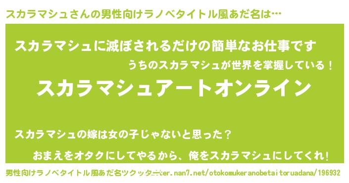 | 女子向けラノベタイトル風あだ名 | 『誰かこのスカラマシュを説明してください! ~契約から始まるウェディング~』 |