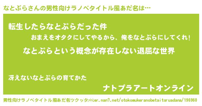 | 女子向けラノベタイトル風あだ名 | 『なとぷらの契約王妃』『なとぷら恋絵巻』 |