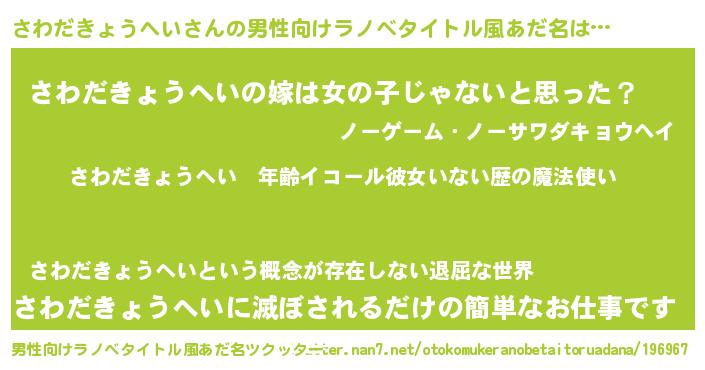 | 女子向けラノベタイトル風あだ名 | 『さわだきょうへいの玉の輿計画!』 |