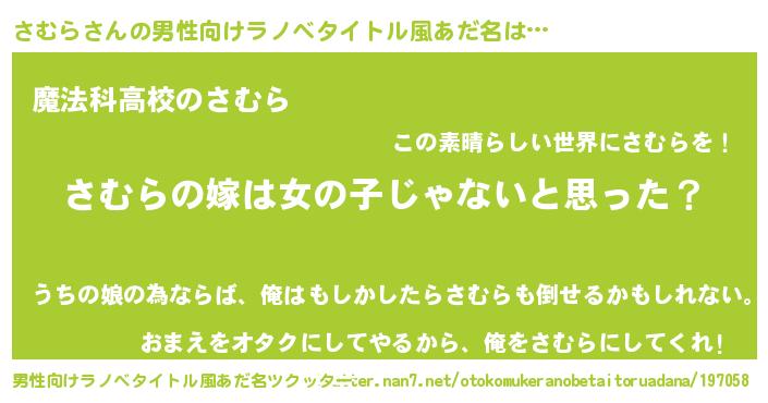 | 女子向けラノベタイトル風あだ名 | 『さむらの卵を拾いまして』 |