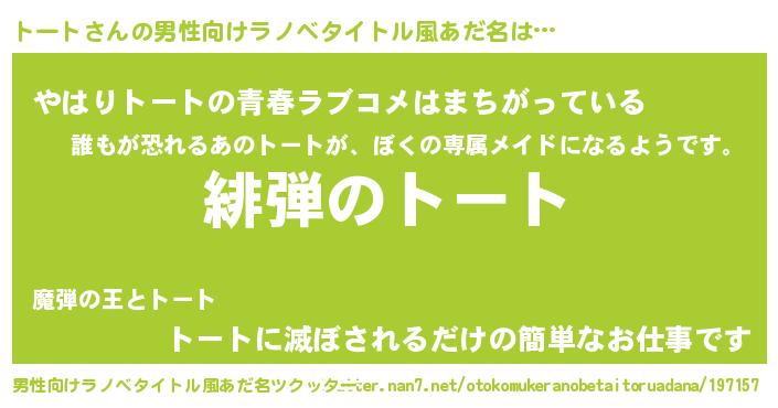 | 女子向けラノベタイトル風あだ名 | 『シンデレラトート家の靴箱館』 |