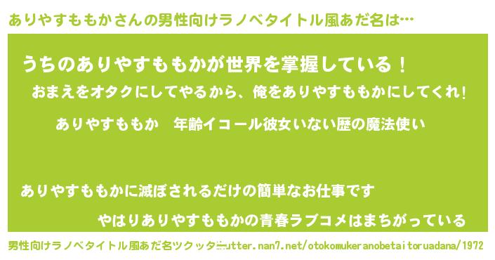 | 女子向けラノベタイトル風あだ名 | 『ありやすももかの玉の輿計画!』 |