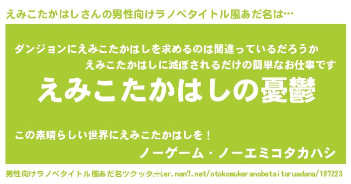 | 女子向けラノベタイトル風あだ名 | 『(仮)えみこたかはしのやんごとなき事情』 |