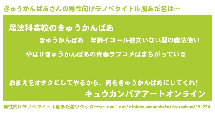 | 女子向けラノベタイトル風あだ名 | 『きゅうかんばあの雑貨屋さん』 |