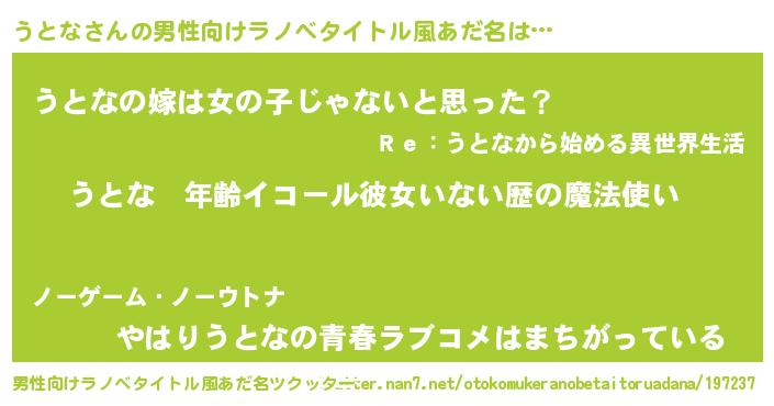 | 女子向けラノベタイトル風あだ名 | 『うとなの玉の輿計画!』『闇のうとな』 |