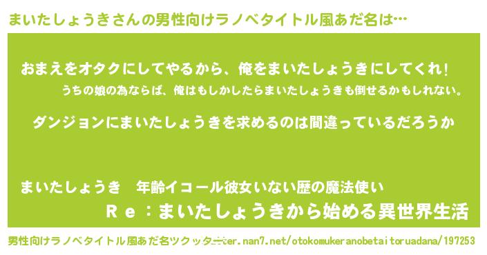 | 女子向けラノベタイトル風あだ名 | 『まいたしょうきの卵を拾いまして』 |
