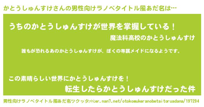 | 胡散臭い通販商品みたいなあだ名 | 『来世でも幸せになれる水素水…その名も「かとうしゅんすけ」』 |