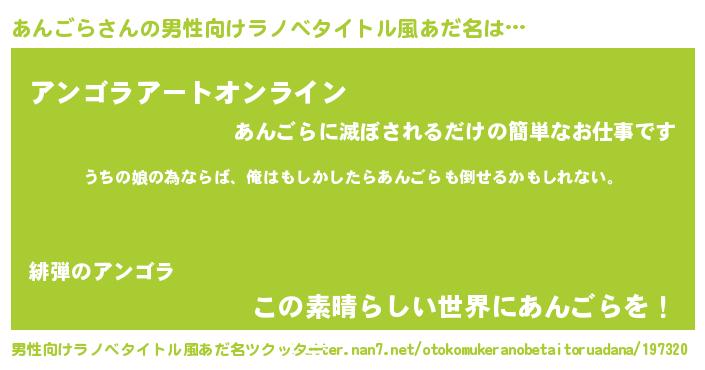 | ファンタジー風あだ名 | 『エターナルアンゴラー』『アンフェル』 |