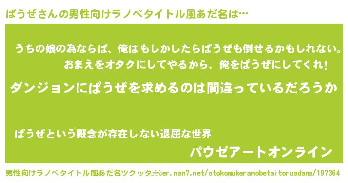 | 胡散臭い通販商品みたいなあだ名 | 『信頼と実績のサプリメント…その名も「ぱうぜ」』 |