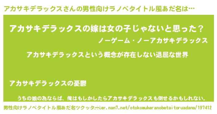 | 胡散臭い通販商品みたいなあだ名 | 『来世でも幸せになれる健康食品…その名も「アカサキデラックス」』 |