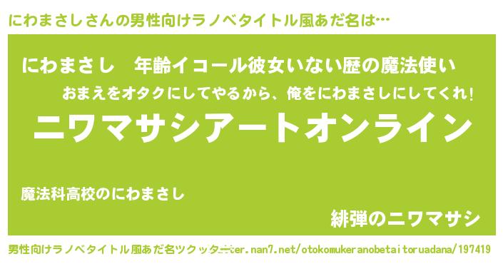 | 女子向けラノベタイトル風あだ名 | 『誰かこのにわまさしを説明してください! ~契約から始まるウェディング~』 |