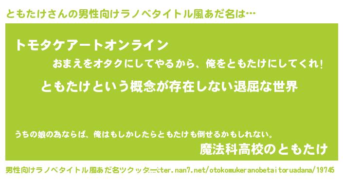 | 女子向けラノベタイトル風あだ名 | 『異世界で失敗しない100のともたけ』 |