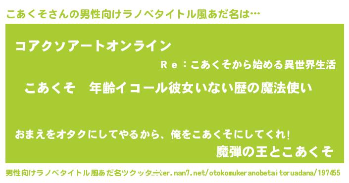 | 女子向けラノベタイトル風あだ名 | 『こあくその玉の輿計画!』 |