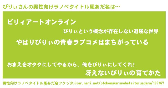 | 女子向けラノベタイトル風あだ名 | 『びりぃの雑貨屋さん』 |