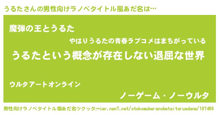 | 女子向けラノベタイトル風あだ名 | 『異世界で失敗しない100のうるた』 |
