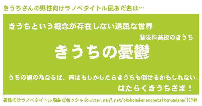 | 女子向けラノベタイトル風あだ名 | 『(仮)きうちのやんごとなき事情』 |