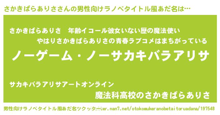 | 女子向けラノベタイトル風あだ名 | 『死神さかきばらありさの再婚』 |