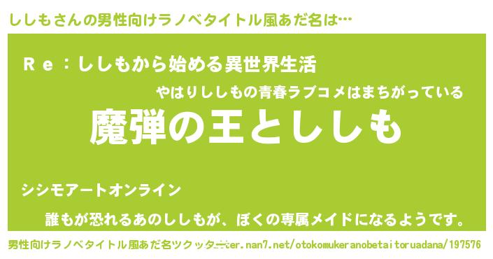 | 意味不明あだ名 | 『住所不定無職ししも(13歳)』『自称ししも』 |