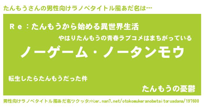 | 女子向けラノベタイトル風あだ名 | 『死神たんもうの再婚』 |