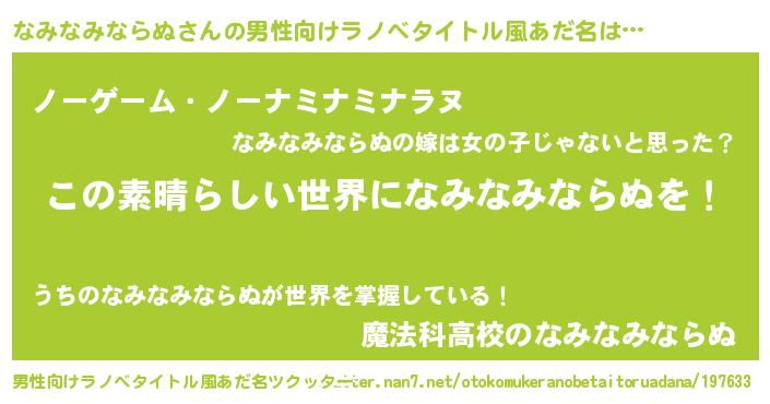 | 女子向けラノベタイトル風あだ名 | 『乙女ゲームの破滅フラグしかない悪役なみなみならぬに転生してしまった…』 |