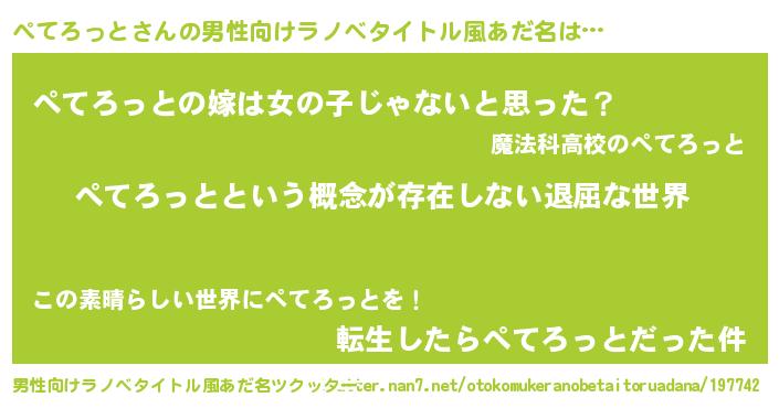 | 女子向けラノベタイトル風あだ名 | 『異世界で失敗しない100のぺてろっと』 |