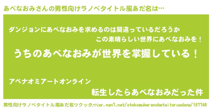 | 女子向けラノベタイトル風あだ名 | 『男装あべなおみの憂鬱な任務』 |