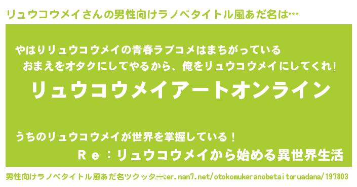 | 女子向けラノベタイトル風あだ名 | 『リュウコウメイ姫と円卓の騎士』 |