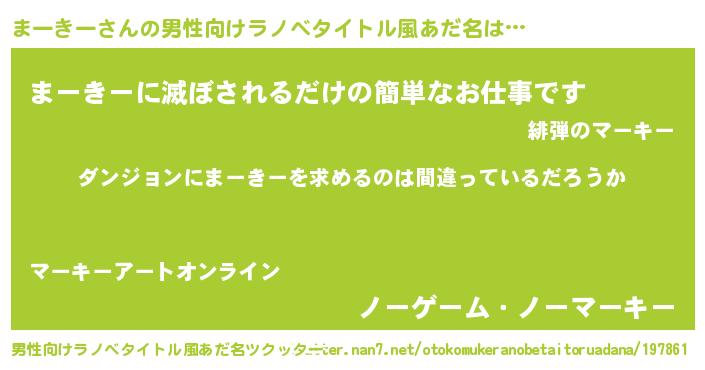 | 女子向けラノベタイトル風あだ名 | 『まーきーの卵を拾いまして』 |