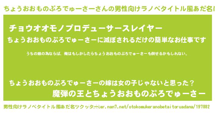 | 女子向けラノベタイトル風あだ名 | 『ちょうおおものぷろでゅーさーの婚約者』 |