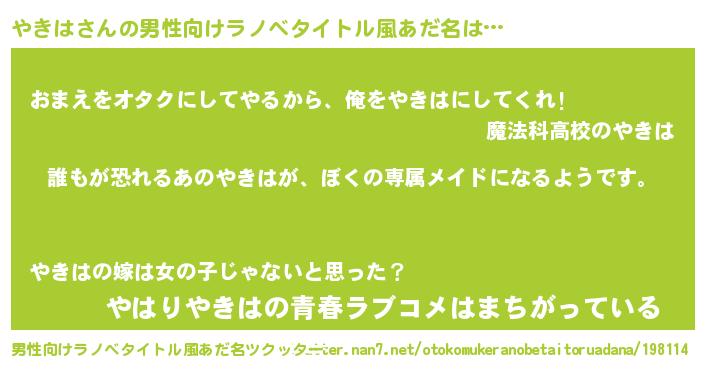 | 女子向けラノベタイトル風あだ名 | 『やきはの契約王妃』『やきは恋絵巻』 |