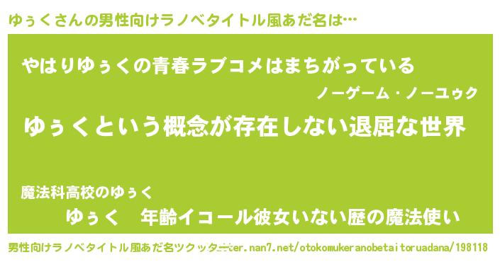 | 女子向けラノベタイトル風あだ名 | 『ゆぅくの契約王妃』『死神ゆぅくの再婚』 |
