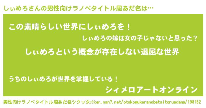 | 女子向けラノベタイトル風あだ名 | 『異世界で失敗しない100のしぃめろ』 |