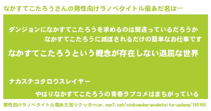| 女子向けラノベタイトル風あだ名 | 『異世界で失敗しない100のなかすてこたろう』 |