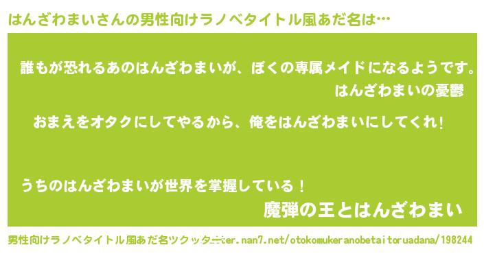 | 女子向けラノベタイトル風あだ名 | 『はんざわまい夫妻のなれそめ』 |