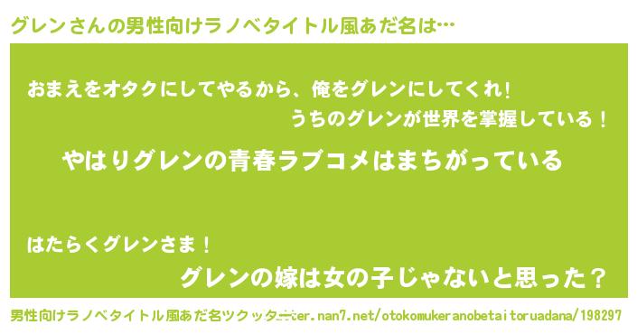 | 女子向けラノベタイトル風あだ名 | 『グレンの雑貨屋さん』『グレン恋絵巻』 |