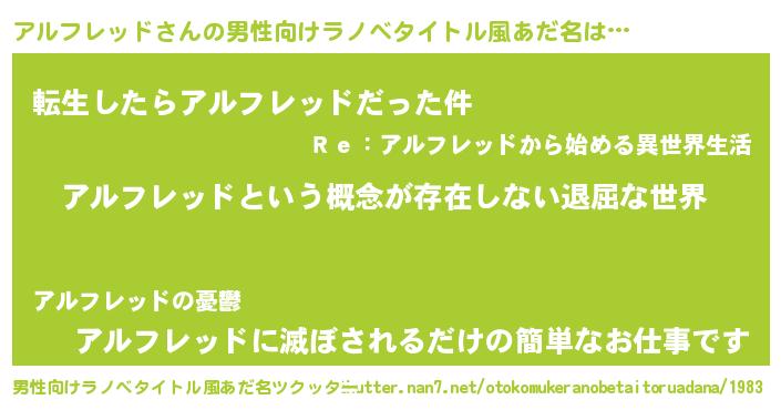 | 女子向けラノベタイトル風あだ名 | 『異世界で失敗しない100のアルフレッド』 |