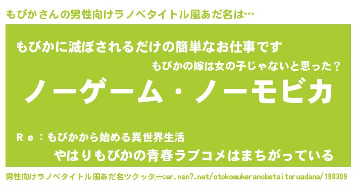 | 女子向けラノベタイトル風あだ名 | 『死神もびかの再婚』『もびか様がみてる』 |