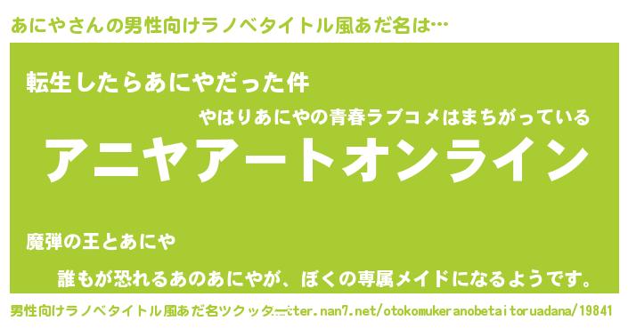 | 胡散臭い通販商品みたいなあだ名 | 『モテモテ間違いなし霊験あらたかなお札…その名も「あにや」』 |