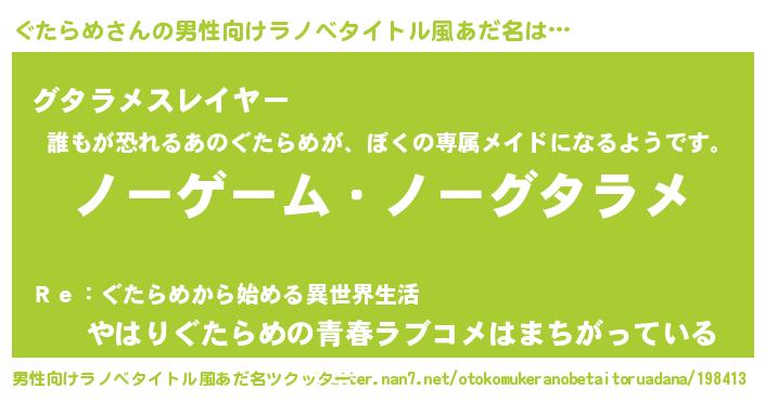 | ヒーロー風カッコイイあだ名 | 『慈愛の使者ぐたらめ』『ネオグタラメ』 |