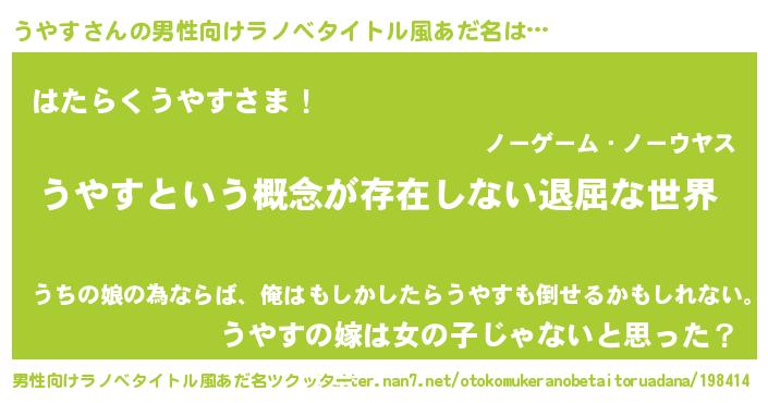 | 女子向けラノベタイトル風あだ名 | 『異世界で失敗しない100のうやす』 |