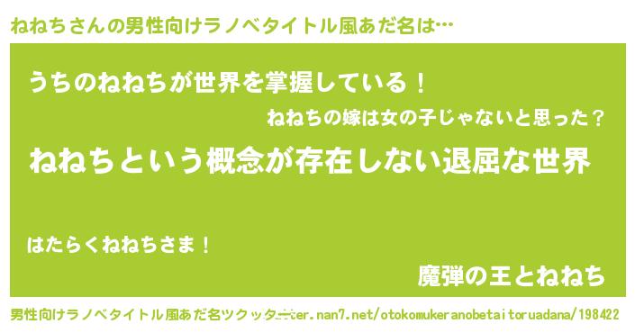 | 女子向けラノベタイトル風あだ名 | 『ねねちの契約王妃』『ねねち様がみてる』 |