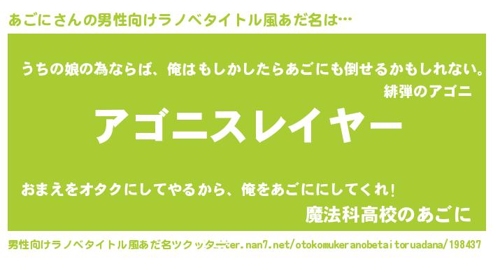 | 意味不明あだ名 | 『めかぶ科あごに属』『自称あごに』 |