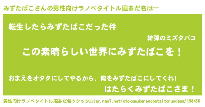 | 女子向けラノベタイトル風あだ名 | 『乙女ゲームの破滅フラグしかない悪役みずたばこに転生してしまった…』 |