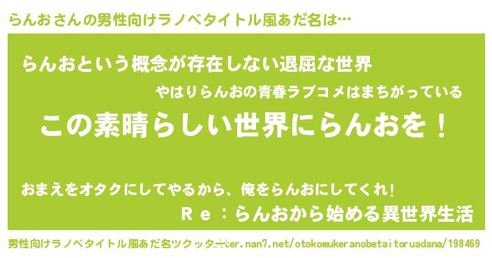 | 女子向けラノベタイトル風あだ名 | 『悪役らんおに転生したようですが、知った事ではありません』 |