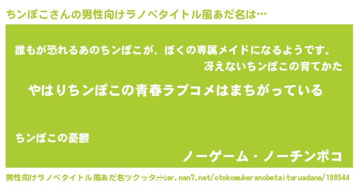 | 女子向けラノベタイトル風あだ名 | 『ちンぽこの雑貨屋さん』 |